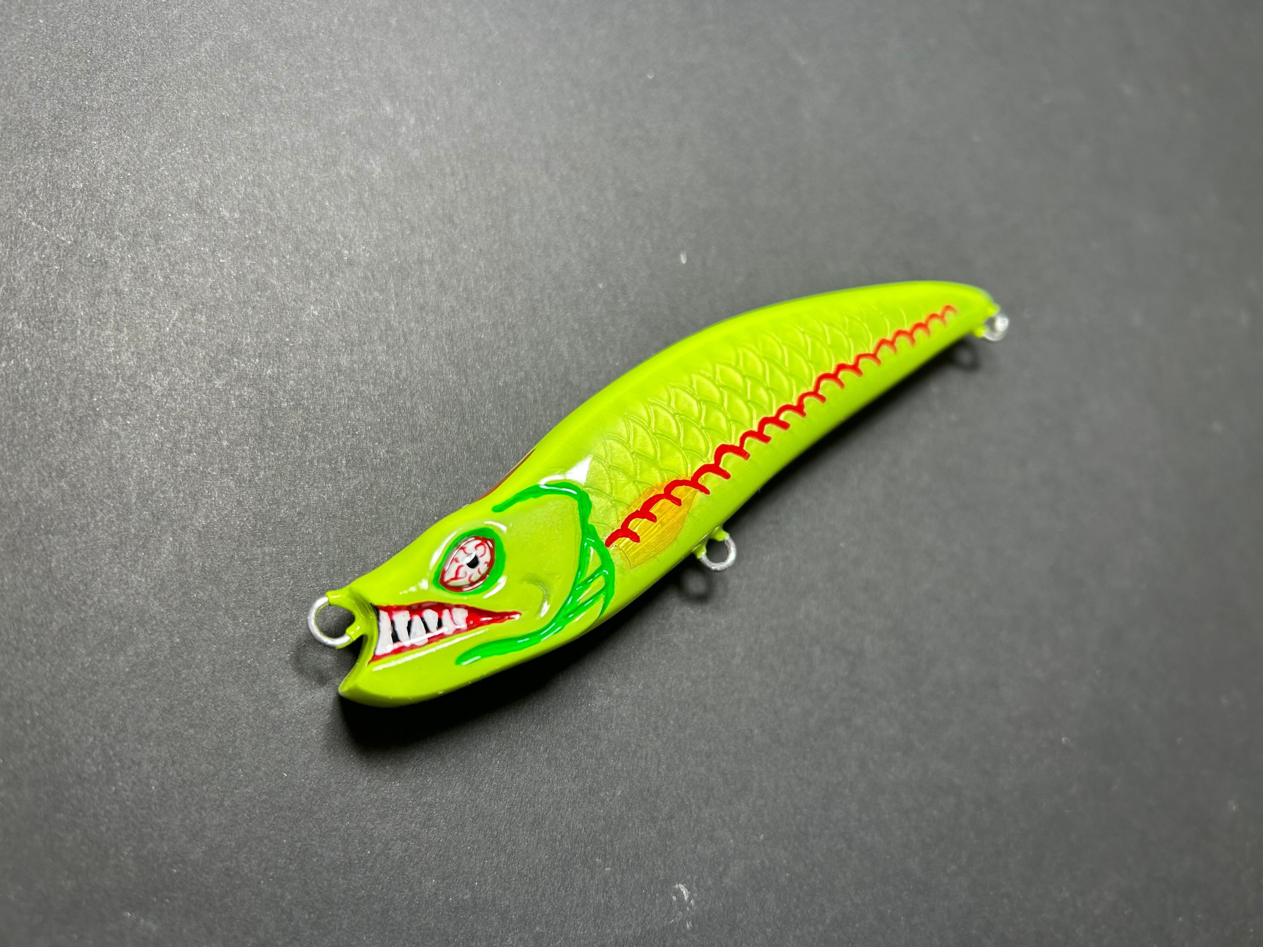 ただ巻きでの使用をメインに調整し、動きは非常に弱々しく、流れの速度が変わる場所を通過する時や、U字ターンをする時等によろめきやすくなっており、ナチュラルな動きでバイトを誘発してヒットを狙うルアーとして製作しました。